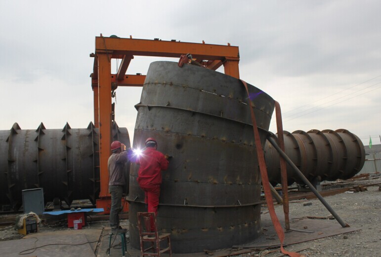 由于以前從來(lái)沒(méi)有制作過(guò),加之管徑的尺寸大,重量又重,給放樣帶來(lái)一定困難,前期他們用油毛氈放樣做樣板,但由于天氣太熱,油毛氈易軟化變形,造成劃線(xiàn)尺寸偏差不標準,他們又改用鋁皮重新放樣,鋁皮不走形,卷制后不變形。根據施工要求和規范大家認真仔細地進(jìn)行放樣、下料、卷板、加固、組對、焊接,經(jīng)過(guò)一番努力和鉆研,終于成功完成方變圓的工藝制作。