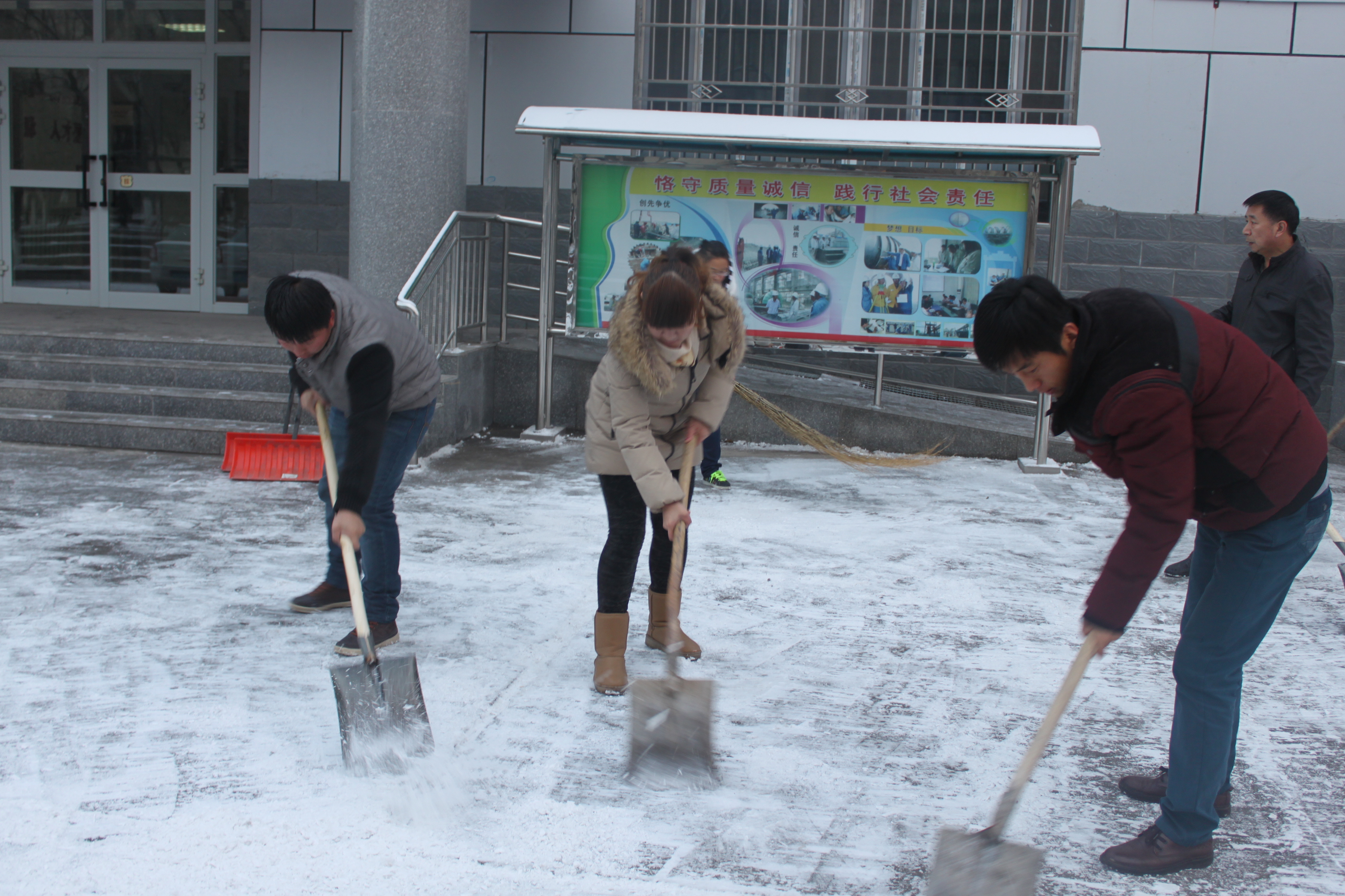 6號一大早,居住在工區宿舍的團員青年們看著(zhù)辦公樓外的積雪,紛紛行動(dòng)起來(lái),自覺(jué)拿上清掃積雪的工具在辦公樓大門(mén)前開(kāi)始清理積雪。雪雖然不是很厚,但因為上凍結冰,來(lái)往的行人步履薄冰小心翼翼,稍不注意就會(huì )仰面朝天。為了及時(shí)清理干凈路面,營(yíng)造安全放心的整潔環(huán)境,有的團員青年顧不上吃早飯就積極行動(dòng)起來(lái)了。大家鏟的鏟、掃的掃,配合默契,不怕冷,不叫苦,不到一個(gè)小時(shí)的功夫,門(mén)前結冰滑行的道路已被清理的干干凈凈。